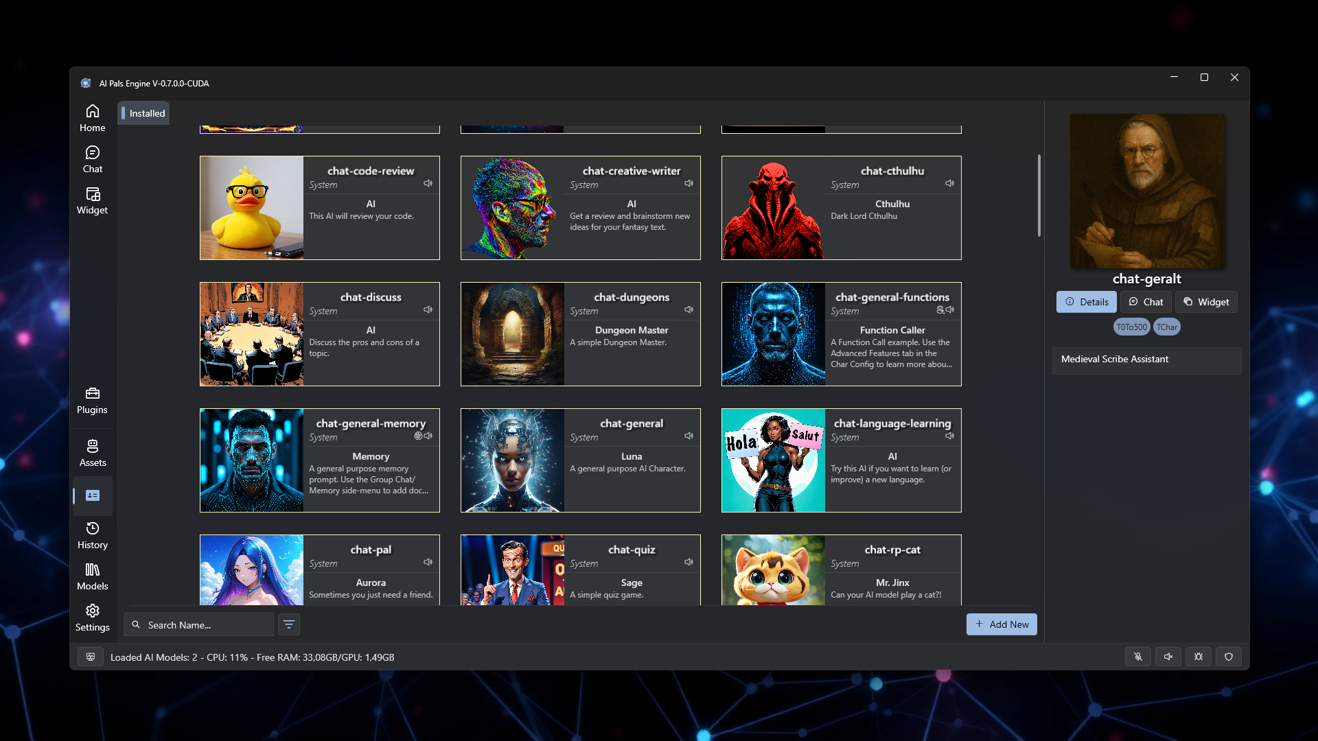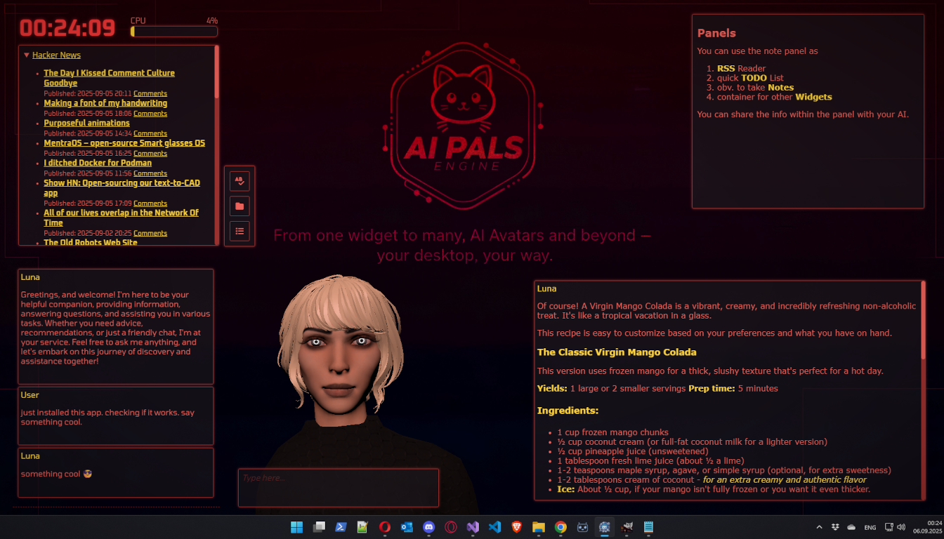 AI Pals Engine is your personal desktop sandbox for powerful, privacy-first AI. Run your own advanced offline and online models with ease, craft custom AI assistants and characters and bring them to life right on your Windows Desktop. No subscriptions, no limits — enjoy unlimited interactions. Your conversations stay securely on your machine, never leaving your PC. While AI interaction is one of its defining features, you can fully enjoy the app even without it. Customize your space with dynamic widgets and animated pals that come alive right on your desktop.